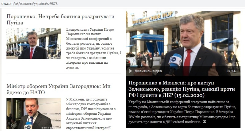 На фоне такого безразличного отношения к Владимиру Зеленскому со стороны германских журналистов комично и цинично выглядело то, сколько внимания уделило его предшественнику государственная Deutsche Welle, уточним – её украинская редакция. По состоянию на вечер воскресенья стартовая страница СМИ выглядела как показано ниже. Комментарии, как говорится, излишни.
