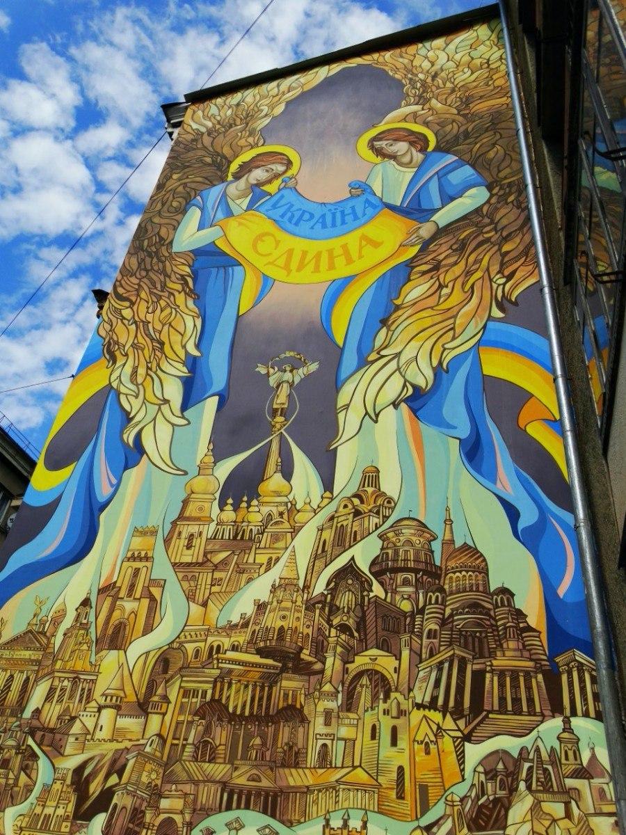 «Были изображены два ангела, которые в руках держат желто-голубой флаг над Украиной. Им они как бы объединяют Восток и Запад Украины. Ангелы также символизировали мощную силу Божьей защиты Украины, которая изображена на панно в виде многообразия архитектурных памятников», – говорится в сообщении.