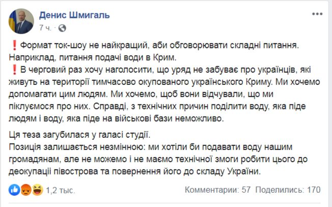 «Формат ток-шоу не лучший, чтобы обсуждать сложные вопросы. Например, вопрос подачи воды в Крым. В очередной раз хочу подчеркнуть, что правительство не забывает об украинцах, которые живут на территории временно оккупированного украинского Крыма. Мы хотим помогать этим людям. Мы хотим, чтобы они чувствовали, что мы заботимся о них. Действительно, по техническим причинам поделить воду, которая пойдет людям и воду, которая пойдет на военные базы, невозможно. Этот тезис потерялась в шуме студии», - написал Шмыгаль у себя в Facebook.