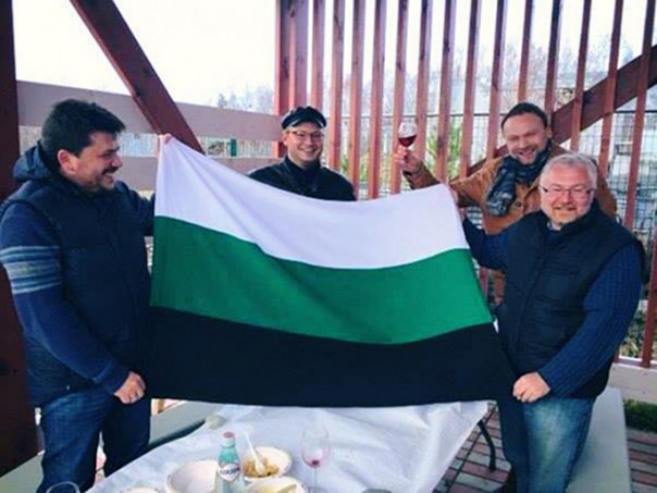 Либероппы Леонид Волков, Ярослав Ширшиков, Федор Крашенинников и Константин Киселев с флагом так называемой Уральской республики