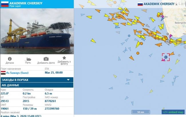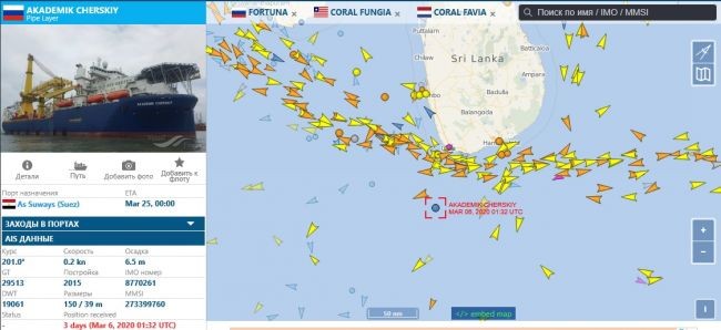 По данным навигационного портала Vesselfinder, трубоукладчик «Академик Черский» подошел к Шри-Ланке 3 марта и сразу поменял маршрут на Суэцкий канал. Однако судно стояло у берегов острова три дня, а 6 марта просто отключило автоматическую идентификационную систему (АИС).