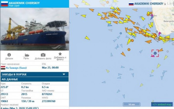 Трубоукладчик поменял курс со Шри-Ланки на Суэцкий канал, но простоял у острова несколько дней. После чего отключило передачу данных. В тот же день Шри-Ланку покинул российский боевой корабль, который направился по маршруту трубоукладчика — к Аденскому заливу, который ведет к Суэцкому каналу.