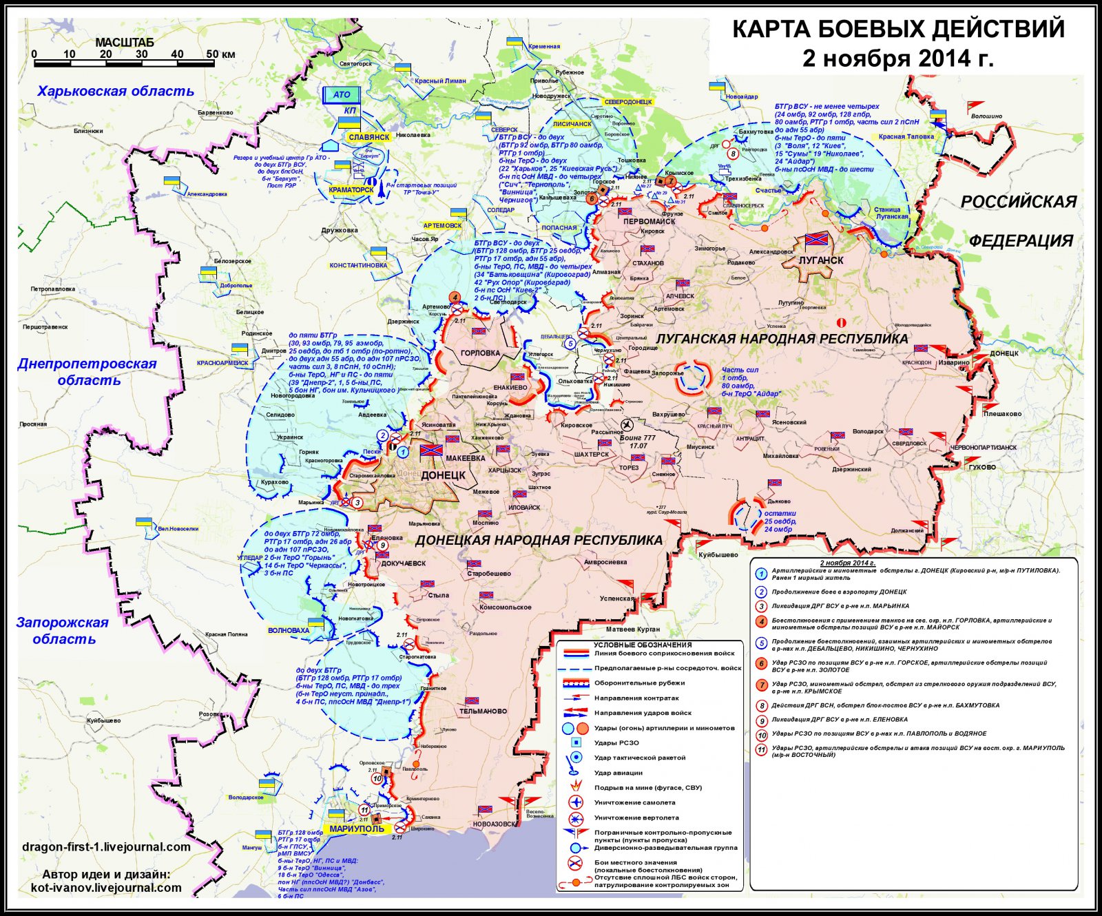 Тем не менее, на фронтах сохраняется напряжённая ситуация: по-прежнему горячими точками остаются Донецкий аэропорт и пригороды Донецка, в районе Шахтёрского выступа, у н.п. Никишино боевые действия не прекращаются, а в районе кургана Могила-Острая у н.п. Полевое 03 ноября произошло танковое сражение.