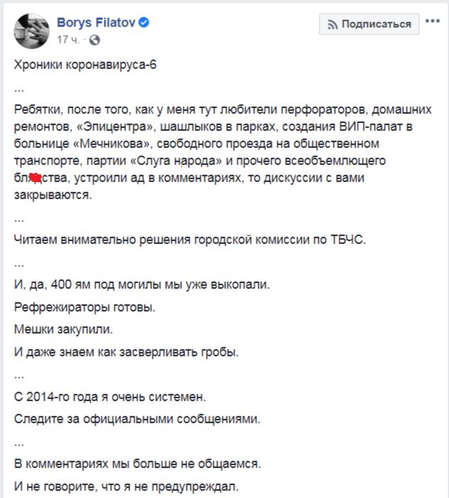 «Ребятки, после того, как у меня тут любители перфораторов, домашних ремонтов, «Эпицентра», шашлыков в парках, создания ВИП-палат в больнице «Мечникова», свободного проезда на общественном транспорте, партии «Слуга народа» и прочего всеобъемлющего бл**ства, устроили ад в комментариях, то дискуссии с вами закрываются», - заявил Филатов.