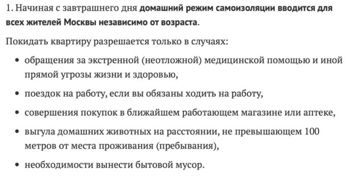 1. Начиная с завтрашнего дня домашний режим самоизоляции вводится для всех жителей Москвы независимо от возраста.