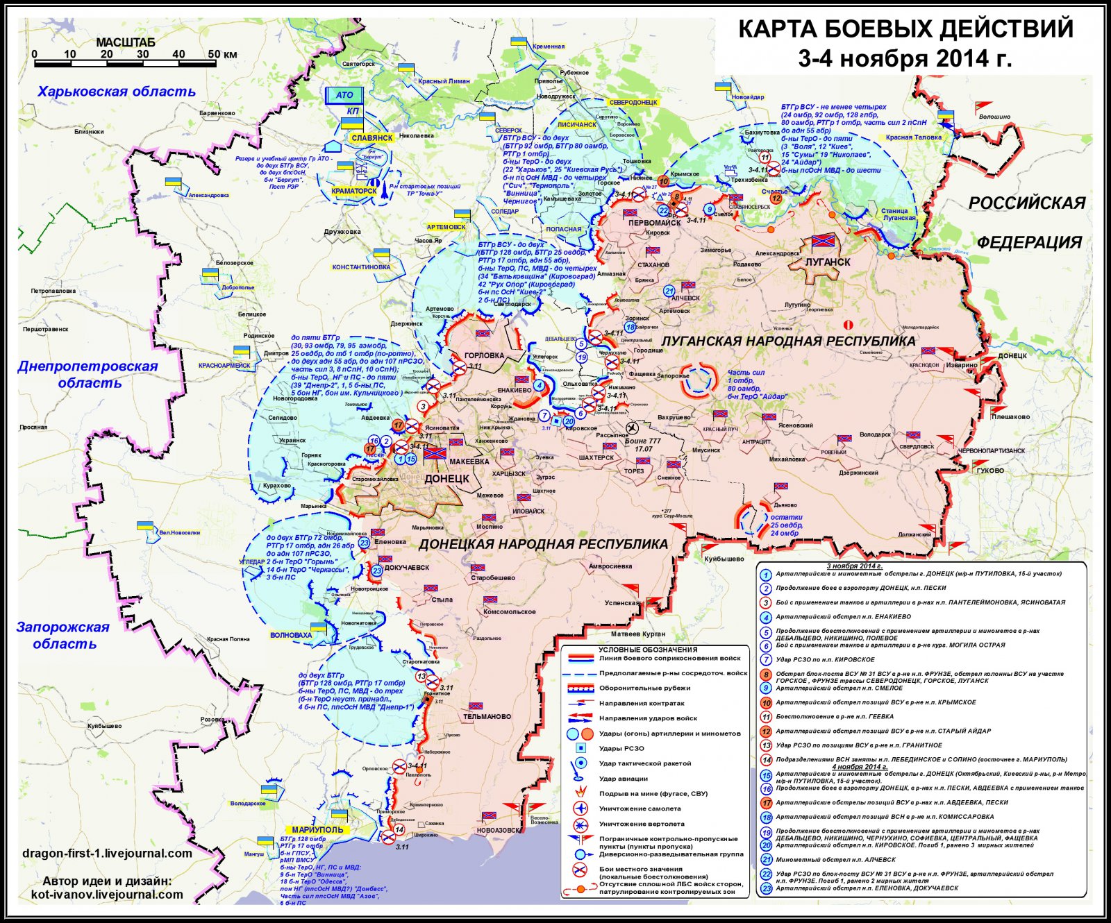 Всю ночь с 03 на 04 ноября украинские военные производили обстрел Донецкого аэропорта и Донецка, применялись, в том числе и зажигательные мины, вызвавшие несколько пожаров. Около часа ночи по московскому времени армия Новороссии стала отвечать контрбатарейным огнем, начались артиллерийские дуэли. С утра в Донецком аэропорту были слышны взрывы и автоматные и пулемётные очереди. Днём в аэропорту шёл танковый бой между ополчением и киевскими силовиками. К вечеру боестолкновения в Донецком аэропорту продолжились артиллерийскими дуэлями между ВСУ и ВСН.