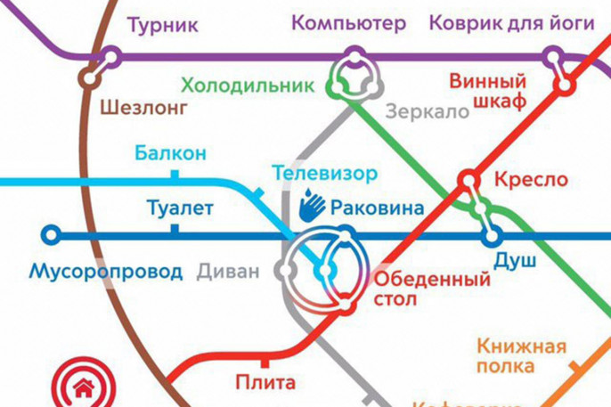 В основе карты - квартира. Станции метро стали обеденным столом ("Библиотека имени Ленина"), холодильником ("Тверская"), плитой ("Кропоткинская"), раковиной ("Арбатская"), душем ("Площадь Революции"), туалетом ("Смоленская"), диваном ("Боровицкая"), винным шкафом ("Лубянка"), компьютером ("Пушкинская"), ковриком для йоги ("Кузнецкий Мост"), шезлонгом ("Краснопресненская") и т. д.