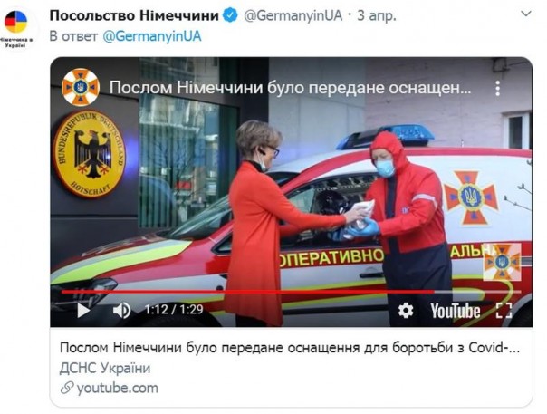 «Германия передаёт груз с защитным оснащением и дезинфицирующими средствами. Посол ФРГ в Украине Анка Фельдгузен: Борьба с Covid-19 — это задание мирового сообщества», — сообщило в своём твиттере германское дипломатическое представительство в Киеве, не постеснявшись уточнить, что речь идёт о «13 защитных костюмах, 140 масках и 200 аппаратах для дезинфекции на общую сумму 175 тысяч евро».