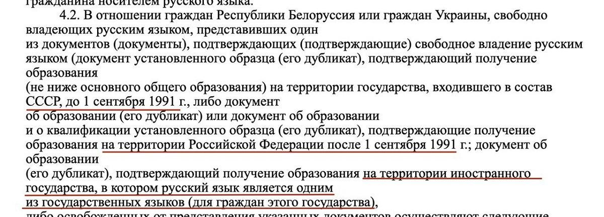 Согласно документу, на упрощённую процедуру теперь смогут надеяться только три категории: получившие аттестат до 1991 года, получившие российский аттестат или диплом после 1991 года и граждане тех государств, где русский язык является одним из государственных.