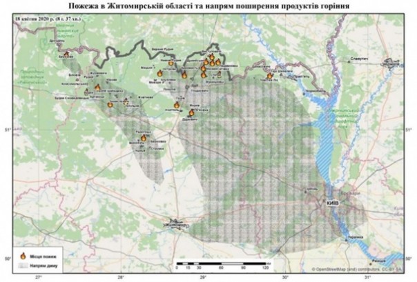 "Причина загрязнения воздуха вокруг Киева - пожары в Житомирской области. Прогорело 7800 га лесной подстилки. Было 15 очагов, ликвидировано 6, локализовано 5, на 4 работаем", - написал министр.