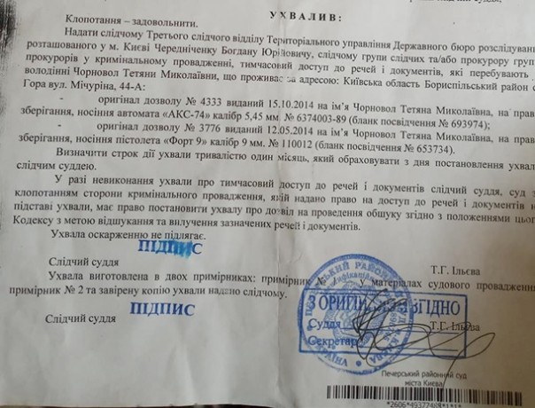 Также она обнародовала фотографии постановления суда и самих удостоверений. В постановлении отмечается, что суд принял решение предоставить следователям временный доступ к вещам и документам, которые находятся во владении Чорновол, "а именно: к оригиналу разрешения №4333, выданного 15 октября 2014 года на имя Татьяны Чорновол, на право хранения, ношения автомата АКС-74 калибром 5, 45 мм №63 74003-89 (бланк удостоверения №693974), а также – к оригиналу разрешения № 3776, выданного 12 мая 2014 года на имя Татьяны Чорновол, на право хранения, ношения пистолета Форт 9 калибром 9 мм, №110012 (бланк удостоверения № 653734).