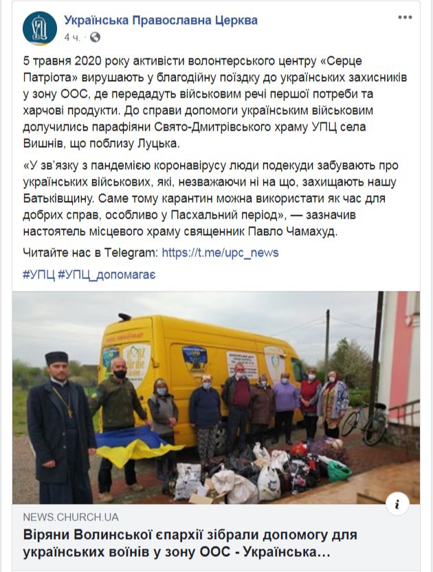 «5 мая активисты волонтерского центра «Сердце Патриота» отправляются в благотворительную поездку к украинским защитникам в зону ООС, где передадут военным предметы первой необходимости и продукты питания. К делу помощи украинским военным присоединились прихожане Свято-Дмитриевского храма УПЦ села Вишнев, что вблизи Луцка», - говорится в сообщении.