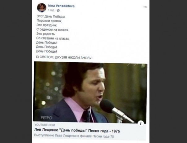 Ирина Венедиктова написала пост ко Дню победы, прикрепив видео песни Льва Лещенко "День Победы", затем удалила ролик и извинилась.