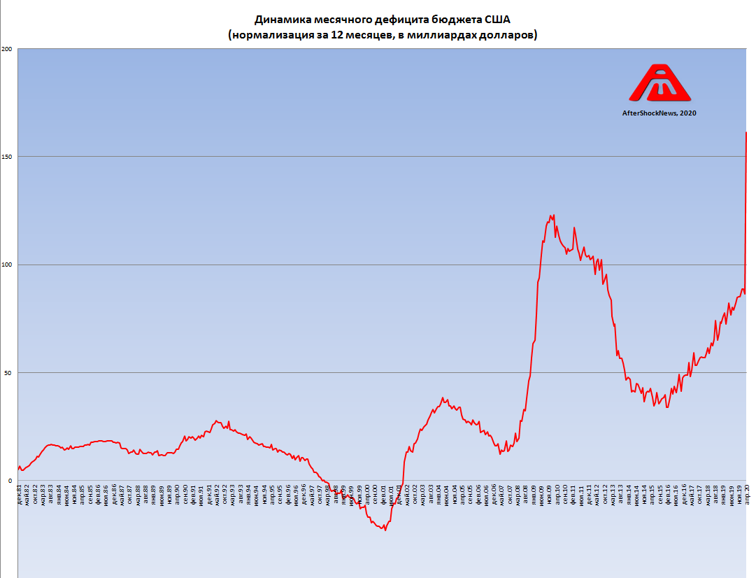 2. Кто-то скажет, это разовый всплеск. Хорошо, смотрим нормализацию (усреднение) за 12 предыдущих месяцев. Доходы бюджета США составляли $272 ярда (годовое падение -3.4%), расходы бюджета составляли $433 ярда (годовой прирост +19%), дефицит бюджета $161 ярд (годовой прирост +96% - почти в разы!). На графике это выглядит так: