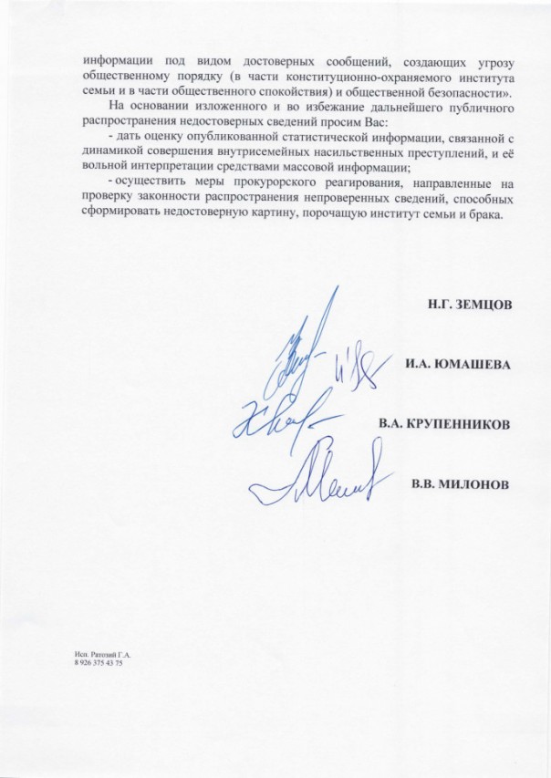 13 мая члены Комитета Госдумы РФ по развитию гражданского общества, вопросам общественных и религиозных объединений) Николай Земцов, Владимир Крупенников, Виталий Милонов и член Комитета ГД по международным делам Инга Юмашева направили письмо генеральному прокурору России Игорю Краснову с просьбой ("во избежание дальнейшего публичного распространения недостоверных сведений") "дать оценку опубликованной статистической информации, связанной с динамикой совершения внутрисемейных насильственных преступлений" и "осуществить меры прокурорского реагирования, направленные на проверку законности распространения непроверенных сведений, способных сформировать недостоверную картину, порочащую институт семьи и брака".