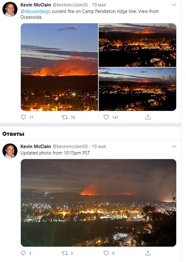 Отдел шерифа округа Сан-Диего предупредил в своем официальном аккаунте в Твиттере: «Если вы живете в SDSO Fallbrook и SDSOVista, имейте в виду, что в вашем районе может быть виден дым от пожара кистью в Кэмп-Пендлтоне».
