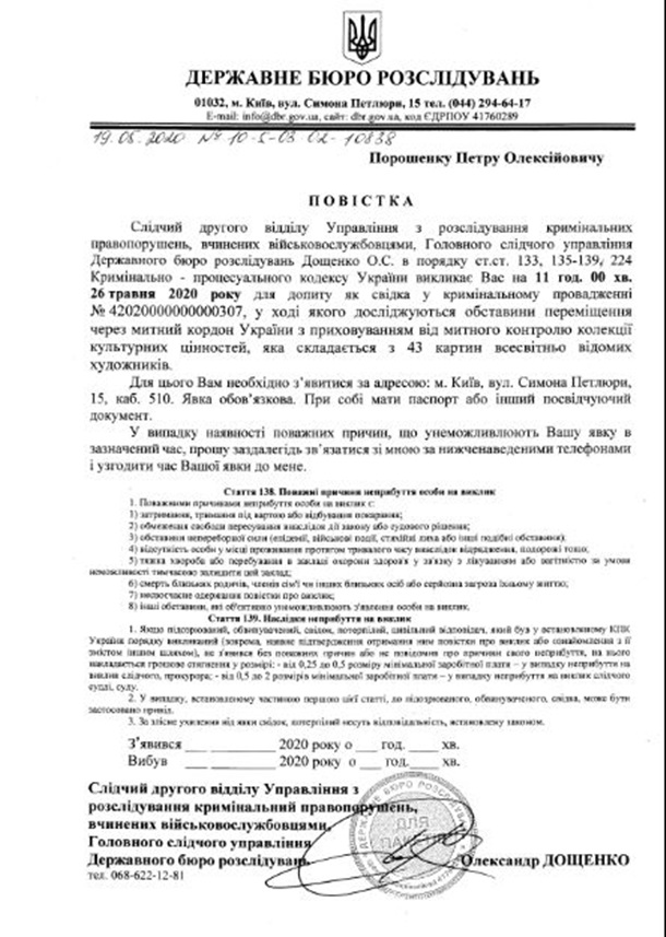 Порошенко вызвали в Государственный бюро расследований для допроса в качестве свидетеля на 26 мая на 11 утра по уголовному производству № 42020000000000307, в котором исследуются обстоятельства перемещения через таможенную границу Украины с сокрытием от таможенного контроля коллекции культурных ценностей, которая состоит из 43 картин всемирно известных художников.