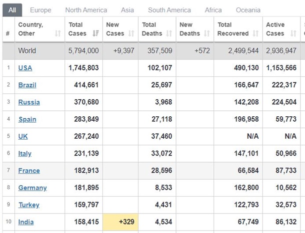 Всего в мире уже 5 794 000 заболевших коронавирусом, 357 509 больных умерли, 2 499 544 – выздоровели.