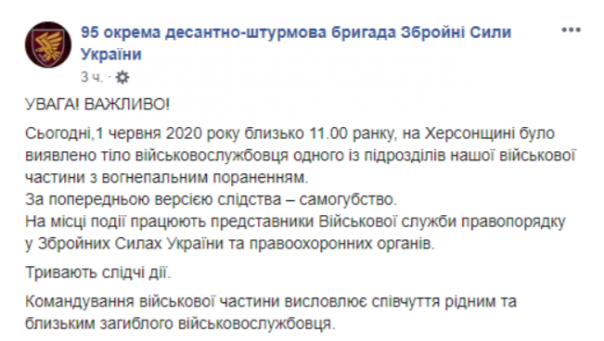 «Сегодня, 1 июня 2020 года, около 11:00 на Херсонщине было обнаружено тело военнослужащего одного из подразделений нашей воинской части с огнестрельным ранением. По предварительной версии следствия - самоубийство», - сообщили в бригаде.