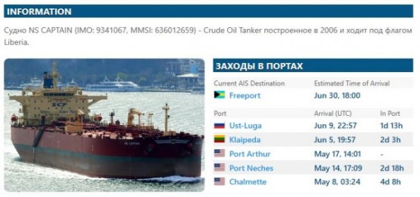 По данным навигационных порталов Marinetraffic и Vesselfinder, танкер NS Captain доставил 5 июня из американского Порт-Артура в Клайпеду груз нефти. 77 тыс. тонн сырья сорта Bakken отправили цистернами на белорусские НПЗ.
