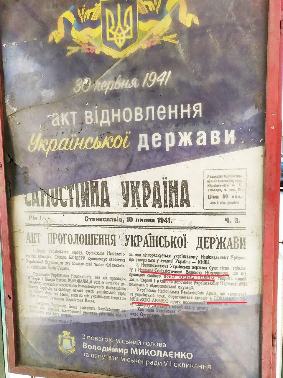 Напомним, что ранее от имени мэра Херсона Мыколаенко на улицах города появились поздравительные баннеры, с фрагментом текста «Акта провозглашения Украинской державы» со стыдливо прикрытым жовто-блакитной лентой местом, где упоминается «Национал-Социалистическая Великая Германия под предводительством вождя Адольфа Гитлера», а также «Союзная немецкая армия». Теперь же в городе обнаружились плакаты, где можно увидеть весь текст «Акта».