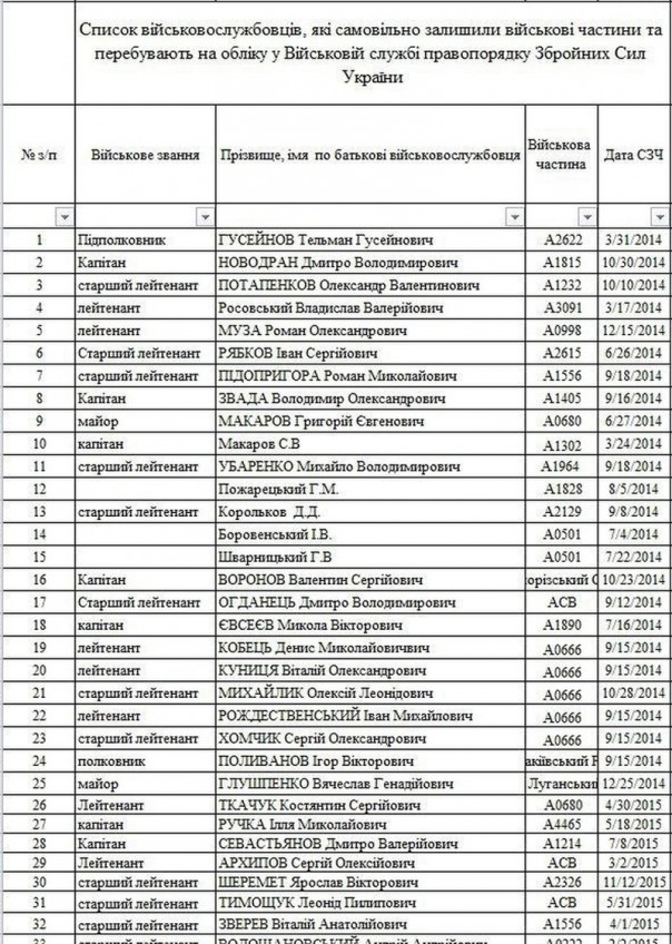 В Интернет обнародованы списки со всеми данными 6929 военнослужащих главного управления Военной службы правопорядка ВСУ, самовольно покинувших воинские части.