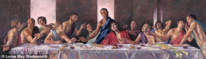 И вот такое... Над алтарём Сент-Олбанского собора в качестве знака солидарности с чёрными расистами-экстремистами из движения Black Lives Matter разместили вариацию картины "Тайная вечеря" с чернокожим Иисусом Христом. Почти трёхметровое полотно.