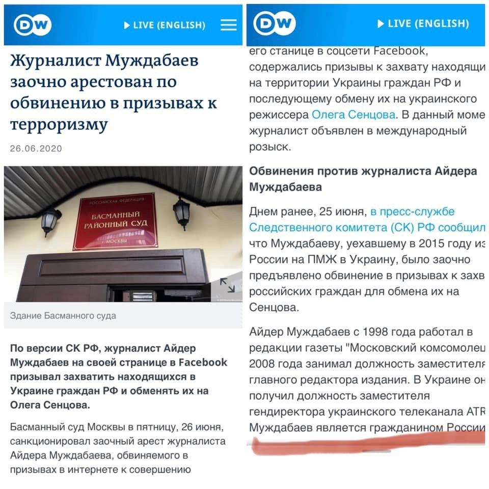 «Пророссийские сотрудники немецкого государственного (на самом деле – такого, что работает по лекалам Кремля) издания DW прекрасно знают, что я крымский татарин и гражданин Украины. Но намеренно лгут, получая деньги от налогоплательщиков ФРГ, и при этом давая в новостях абсолютно русские заголовки, а также прямо помогая власти РФ преследовать неугодных, называя их «своими» гражданами.