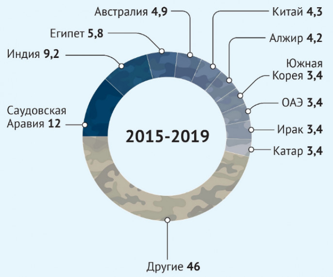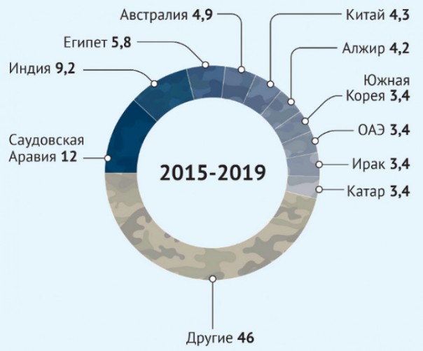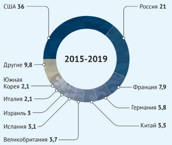 Мировая торговля оружием – прибыльный бизнес, ссылаясь на тот же СИПРИ, посмотрим кто в лидерах по поставкам основных видов обычных вооружений. Ведущие десять государств-экспортёров за период 2016 – 2019 г.г. и их доходы от продаж (в долларах): США – 139,7 млрд., РФ – 53,4 млрд., Франция – 37,5 млрд., Германия – 18,2 млрд., Великобритания – 12,4 млрд., Испания – 11,9 млрд., Израиль – 10,9 млрд. Замыкают топ -10 Китай, Италия и Южная Корея – 10,6 , 7,5 и 5 млрд. соответственно.