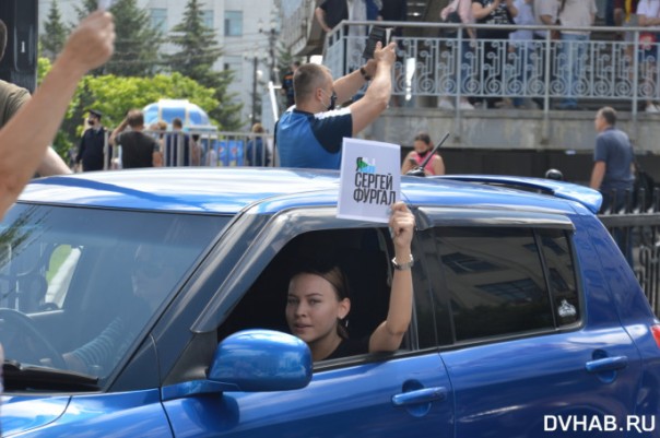 Движение в центре Хабаровска было полностью или частично парализовано. Прорыв ограждений на площади им. Ленина, шествие по центральным улицам, возвращение на площадь. Скандировали вышеупомянутое "Свободу Фургалу!", лозунги "Наш выбор — Фургал!", "Я/мы — Фургал", "Уходи, Москва!", "Дальний восток — наш!". Навальнисты вопили "Мы здесь власть!". Перед собравшимися выступил Алексей Ворсин, руководитель региональной дирекции "Дальний Восток" медиахолдинга "Левиафан" и координатор штаба Навального в Хабаровске (штаб неоднократно судимого блогера вёл онлайн-трансляцию мероприятия). В конце концов люди мирно разошлись, несмотря на попытки радикальных оппозиционеров сделать акцию протеста бессрочной. Пресс-секретарь губернатора Надежда Томченко распространила обращение к жителям края: "Спасибо за вашу поддержку. Такого единодушия ещё не видел ни Хабаровский край, ни Дальний Восток, ни Россия. Мы уверены, что вы будете услышаны. Всё началось с мирной акции поддержки. А ваше шествие по центральным улицам Хабаровска уже сравнили с бессмертным полком".
