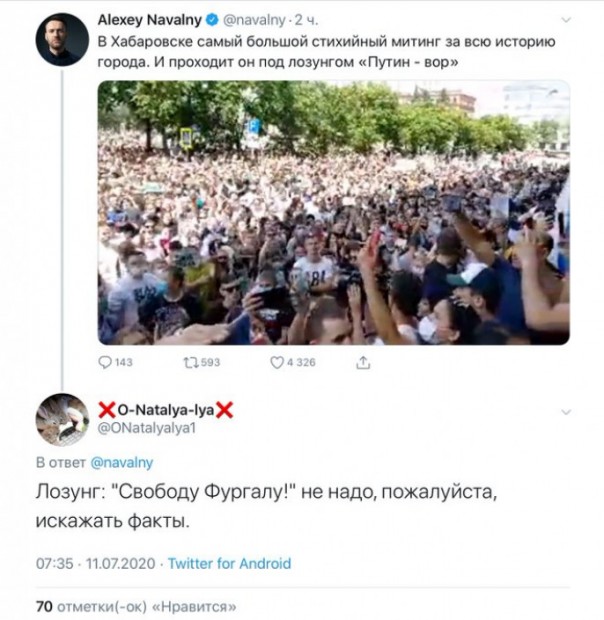 СМИ - от "Коммерсанта" до дождей и медуз - твердят о стихийном характере протестов. Да-да, разумеется. Есть немало сведений о титанических усилиях окружения Фургала по сбору массовки, использовании местного административного ресурса. В частности, по слухам, спешно подвезли рабочих предприятия "Амурсталь". Естественно, власти региона опровергают такие утверждения. "Полиция сообщает, что акция была организована «командой Фургала». Многие воспринимают эту формулировку как «правительство Хабаровского края». Официально заявляю, что правительство Хабаровского края и комитет, возглавляемой мной, не являются организаторами каких бы то ни было протестных мероприятий", - заверила РИА Новости председатель комитета по информационной политике Хабаровского края Анна Губина. Пресс-секретарь Фургала Томченко оперативно обзвонила "Эхо Москвы", "МБХ медиа", "Новую газету" и РБК, пожаловавшись, что некие правоохранители угрожают ей возбуждением уголовного дела за подстрекательство к несанкционированному митингу.