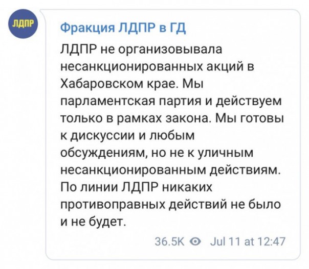 ЛДПР публично открестилась от организации хабаровского митинга.