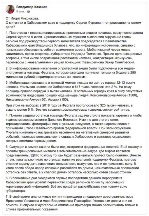 Политолог, член Изборского клуба Андрей Серенко: "Фургал-шоу в Хабаровске (митинги и шествия) лишний раз подтверждает, что протестные настроения в регионах лишь тогда перерастают в протестные действия, если на них существует заказ у местных элит. И для Москвы реальную опасность представляют не недовольные граждане (каким бы массовым это недовольство не было), а группы региональной элиты, готовые и способные трансформировать протестные настроения в действие. Хабаровск выявил технологии такой протестной алхимии. Кстати, ничего с 90-х гг. в этом смысле не изменилось: смычка местного админресурса с теневыми группами (криминальными в том числе), подключение уличного актива ОПГ, немного бабок в народ. Очевидно, что противодействовать такому протестному проекту местных элит можно лишь с использованием ресурса госспецведомств, пресекая его до того, как «никем не организованная» толпа выплеснется на улицы. Хабаровские силовики не смогли или не захотели сработать на опережение. И это ещё один важный вывод из операции «Фургал»: снос глав в регионах с высоким потенциалом агрессивности и отмороженности местных элит необходимо проводить одновременно с блокированием ключевых узлов их сопротивления. Снос таких губернаторов, как Фургал, это спецоперация. И готовиться к ней следует соответственно. В хабаровском эпизоде не подготовились".