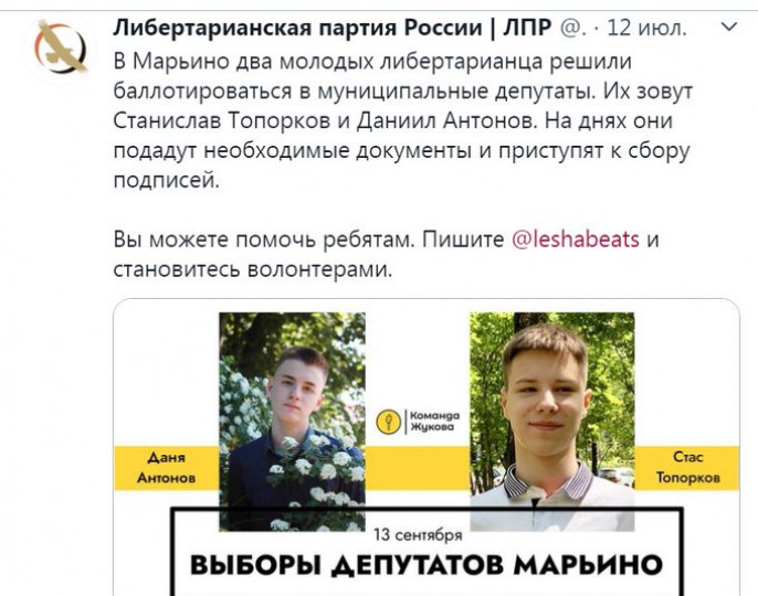 Топорков: "Я вместе со своим другом Даней Антоновым выдвигаюсь в муниципальные депутаты района Марьино на довыборах в сентябре". Он готов к борьбе "за свободу, подчас подвергая собственную жизнь административному давлению" (папкин ремень?). Мы, говорит Стасик, "способны осуществить светлые реформы в самых разных сферах". Ему вторит Антонов: "Привет! Меня зовут Даня Антонов и я выдвигаюсь в муниципальные депутаты района Марьино вместе со своим другом и коллегой Стасом Топорковым. По счастливому стечению обстоятельств именно в Марьино в этом году проходят довыборы муниципальных депутатов. Я принял решение, что хочу представлять интересы жителей района". Избирателям он сообщает: "Мой официальный доход за год составляет 0 рублей. Не говоря уже о том, что совершеннолетним я стану только через неделю. Однако мы сможем изменить страну".