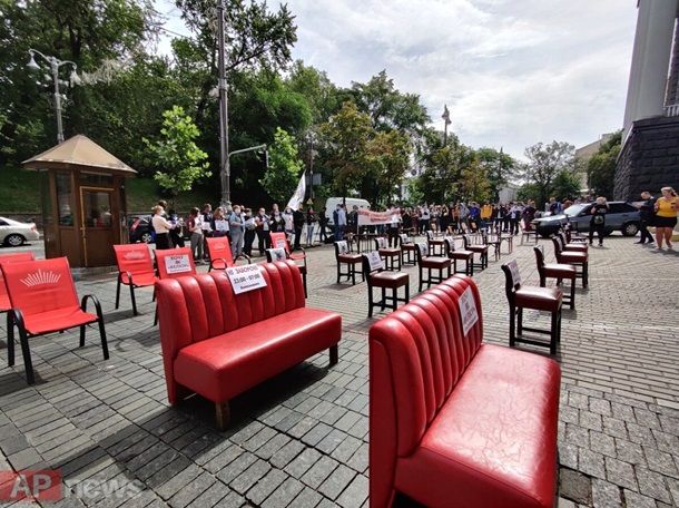 Перед входом в здание Кабмина протестующие выставили кресла и стулья с надписями: "Хочу как Велюр", "Где есть совам?", "Нет запрету 23:00 - 7:00".