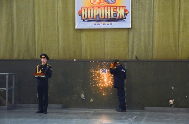 Командующий Северным флотом ВМФ России вице-адмирал Александр Моисеев и врио губернатора Архангельской области Александр Цыбульский на секциях АПЛ установили закладные доски. Почетное право проведения сварочных работ было предоставлено электросварщикам Севмаша Юрию Коробову и Николаю Панасенко.