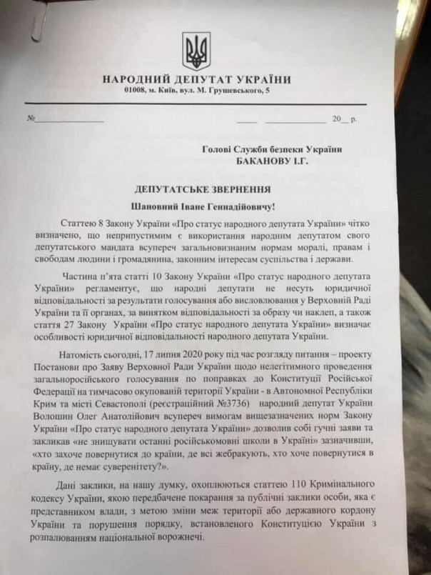 В этой связи группа политических противников ОПЗЖ в виде народных депутатов из фракций «Европейская солидарность», «Голос» и «Слуга народа» и подала обращение к председателю Службы безопасности Украины с требованием начать уголовное производство против депутата из фракции ОПЗЖ Олега Волошина за высказывания об отсутствии у Украины суверенитета.