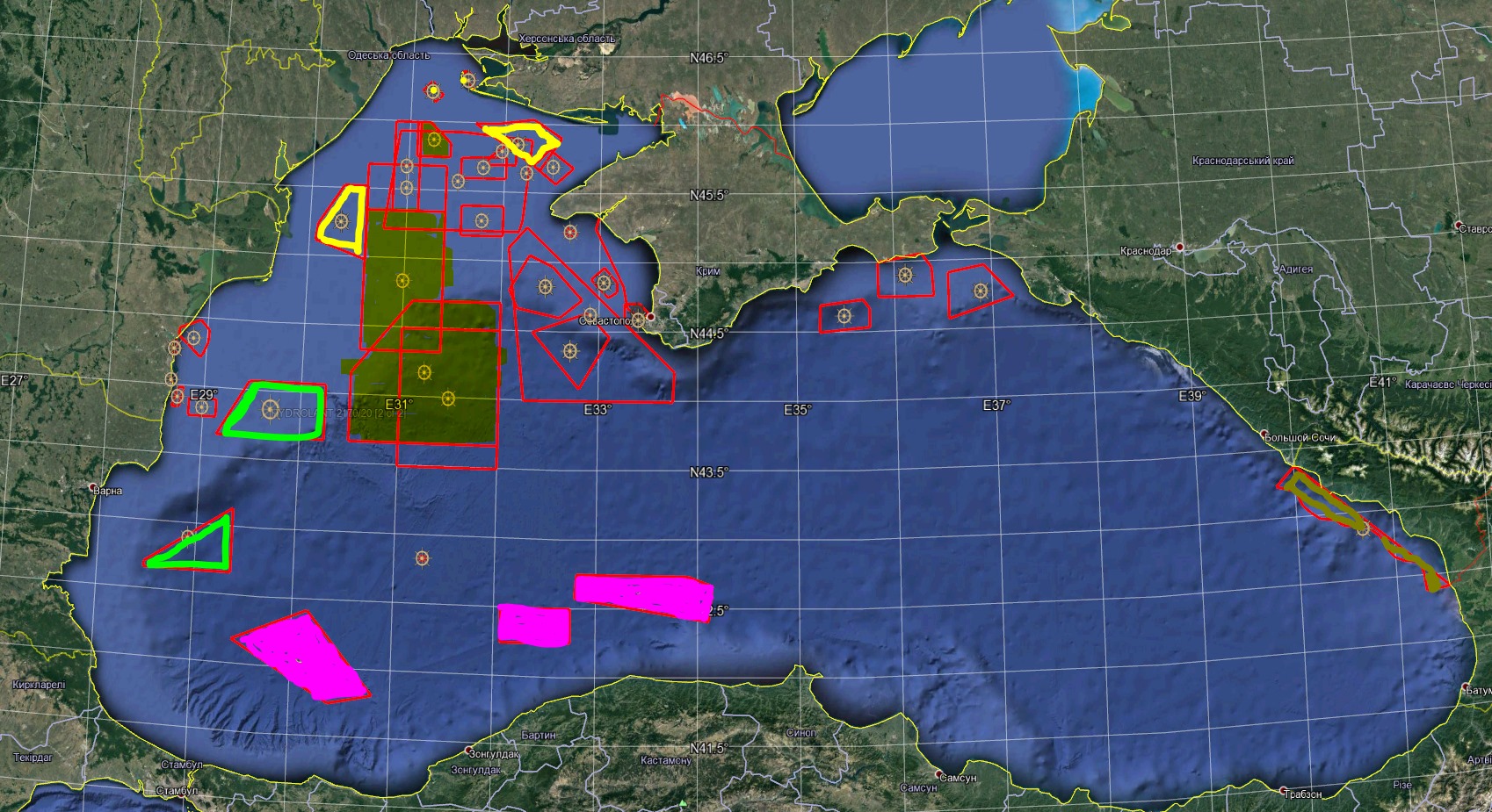 По его данным, на карте зеленоватым прозрачным маркером обозначены участки, перекрытые Румынией для «Си бриз», желтые – перекрытые Украиной, зеленые – Болгарией, розовые – Турцией, темно-зеленые – Грузией.