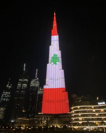 Египет. Бурдж-Халифа и Великие пирамиды Гизы окрасились в цвета Ливана после страшного взрыва в Бейруте
