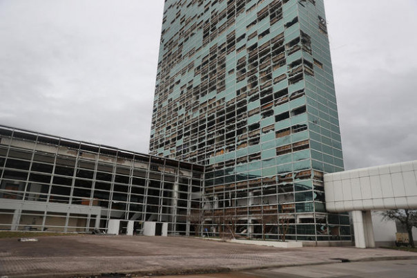 Башня Capitol One Bank Tower с выбитыми окнами в центре города после урагана Лаура 27 августа 2020 года в Лейк-Чарльз, штат Луизиана.