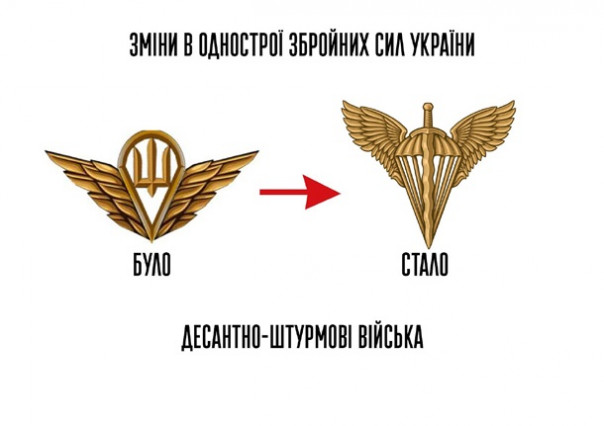 В частности, для Десантно-штурмовых войск внедрена эмблема на воротник, которая в миниатюре повторяет изображение беретного знака: окрыленный парашют, на который наложен пламенный меч. Изменены также эмблемы Медицинской службы и службы ветеринарной медицины.