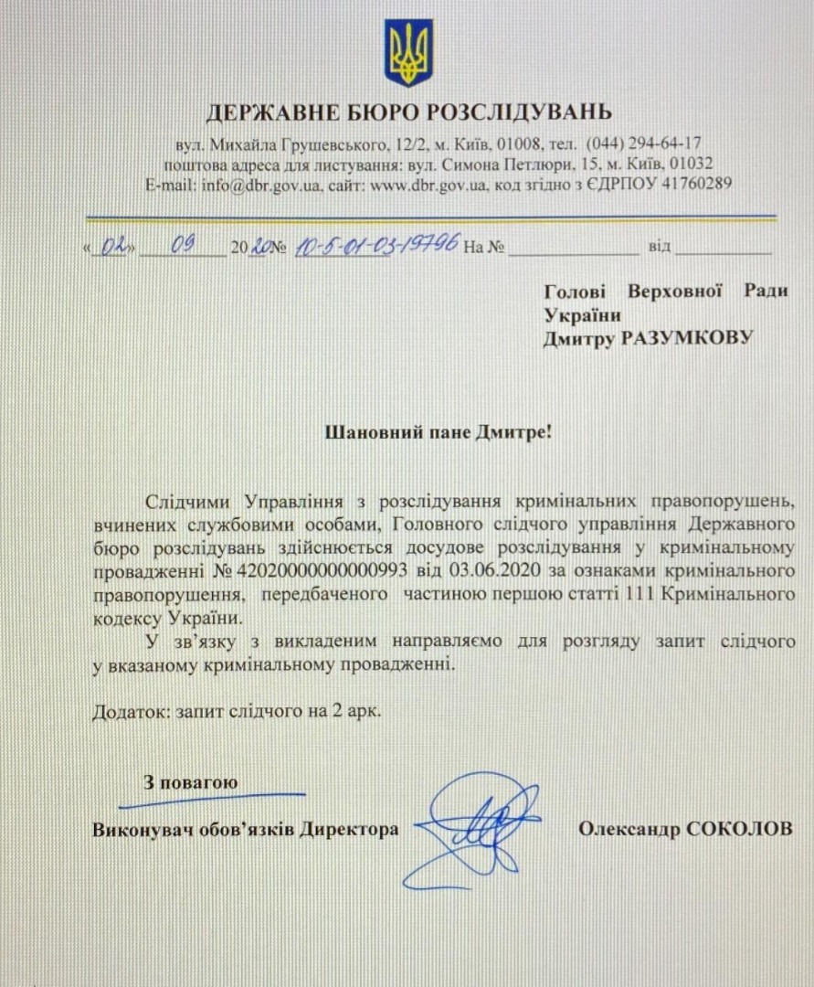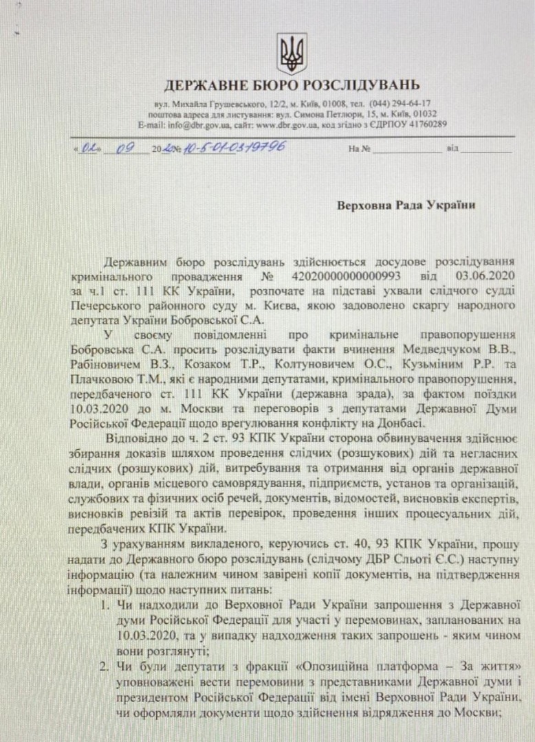 Дело открыто по заявлению депутата от партии «Голос» Соломии Бобровской, в котором говорится о визите в марте 2020 года депутатов от ОПЗЖ Виктора Медведчука, Рената Кузьмина, Александра Колтуновича, Татьяны Плачковой, Вадима Рабиновича в Москву, с целью переговоров в Госдуме РФ.