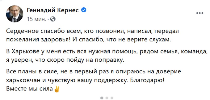 Сам Геннадий Кернес на своей странице в Facebook также обнародовал опровержение, поблагодарил своих сторонников за поддержку и заверил, что продолжает работать и на выборы пойдет. Источник