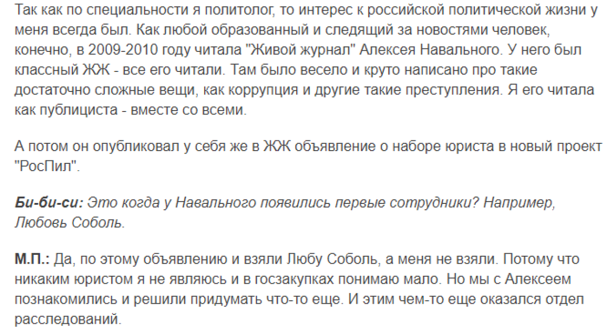Итак, все интервью было выстроено так, чтобы все версии о причастности Марии к отравлению и её связях с британскими политическими кругами показались бредом. Мол, это простая скучная Маша Певчих. Да, она не рядовая сотрудница ФБК, но нет в её биографии ничего такого, за что можно было бы зацепиться.