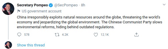 Помпео - Китаю - эй коммунисты хватит жрать планетарные ресурсы