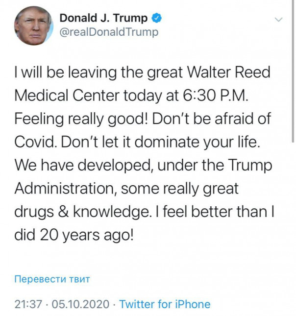 «Сегодня в 18:30 я выйду из медицинского центра Уолтера Рида. Чувствую себя действительно хорошо! Не бойтесь Ковида. Не позволяйте ему доминировать в вашей жизни. При администрации Трампа мы разработали действительно отличные лекарства и знания. Я чувствую себя лучше, чем 20 лет назад!»