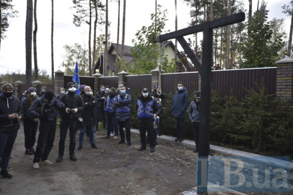 Радикалы пришли протестовать под дом главы Конституционного суда Украины Александра Тупицкого. Антураж привычен: фаеры, лозунги «слава Украине», полиция. Из нового креатива — виселица.