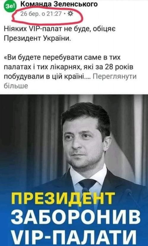"Ни у одного политика или бизнесмена в государственных и коммунальных больницах не будет лучших условий, чем у обычного украинца. Вы будете находиться именно в тех палатах и тех больницах, которые за 28 лет вы построили в этой стране", – написал украинский лидер. Спустя восемь месяцев его заявление приобрело совсем иной смысл. Источник