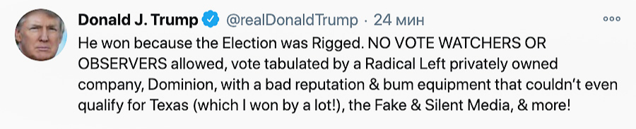 По его словам, победу Байдена обеспечили частная компания Dominion, у которой сложилась «плохая репутация» и было «негодное оборудование», а также замалчивающие нарушения СМИ (речь о производителе ПО для голосования Dominion Voting Systems)