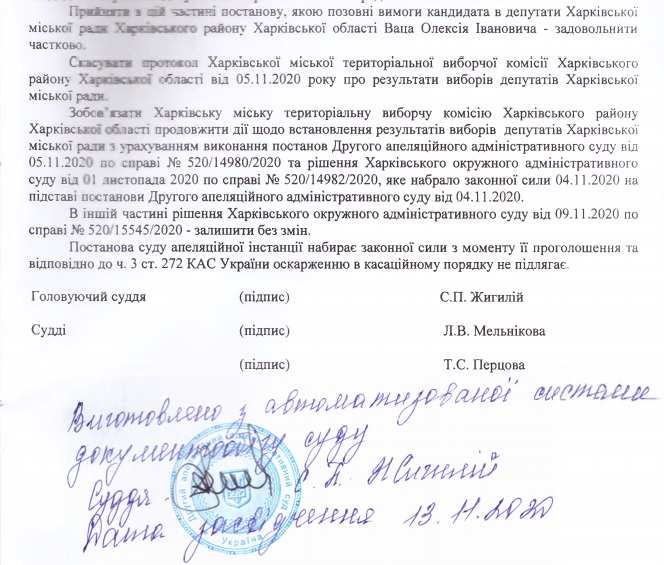 Второй апелляционный административный суд 13 ноября отменил протокол Харьковской городской территориальной избирательной комиссии (ГИК) по результатам выборов в городской совет.